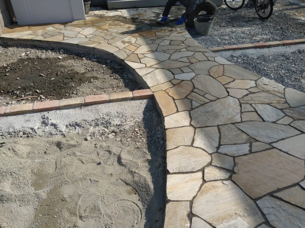 | 工事内容 | 玄関アプローチ石張り工事 人工芝施工・下地整地・防草シート施 外構まわりの調整作業 |
